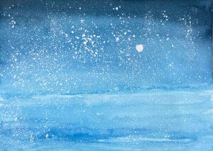透明水彩の淡さを生かして雪景色を描きます。スパッタリングで雪の表情をつけ、季節感たっぷりの作品に仕上げます。